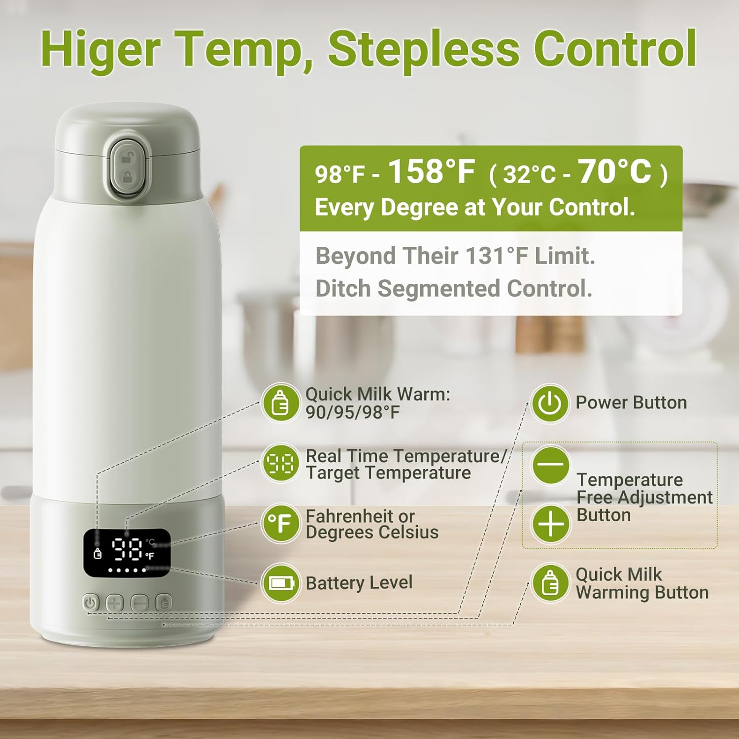 - 🏆 * Perfect Temperature Control * - Precision heating from 98°F to 158°F (single-degree adjustability) with dedicated milk settings at 90°F/95°F/98°F. Our portable milk warmer for baby ensures ideal temperature for breast milk and formula preservation.