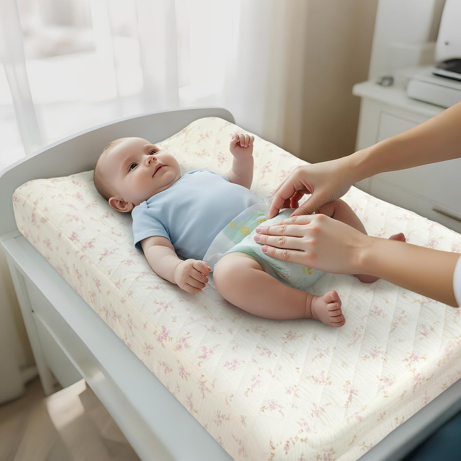- Full Protection and Comfort: Our changing pad cover is made of three layers materials: the top layer is 100% muslin, soft and absorbent for gentle care of your baby’s skin; the middle layer is padded for added thickness and softness, while the bottom layer is waterproof polyester to prevent moisture from seeping through, keeping your changing pad dry and clean