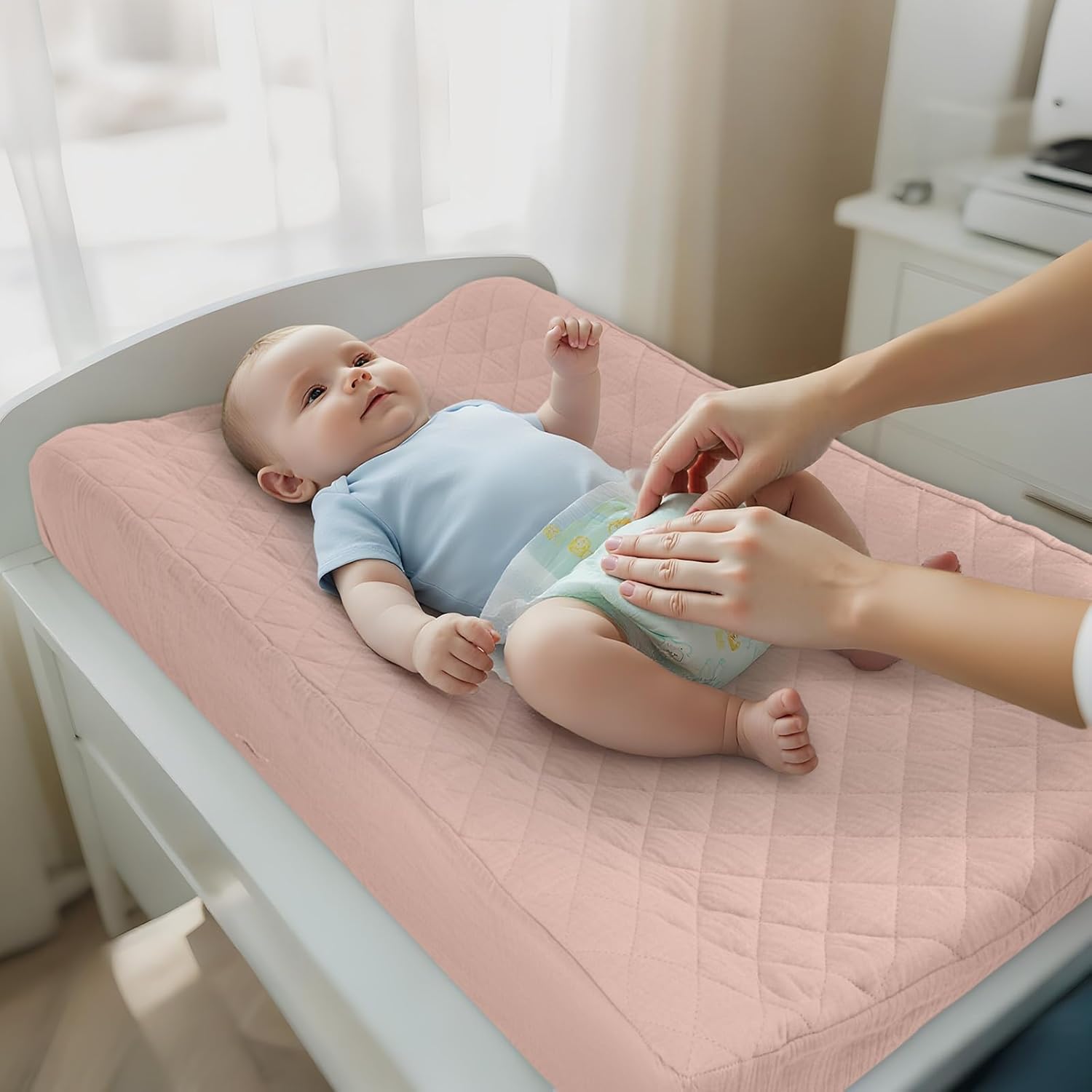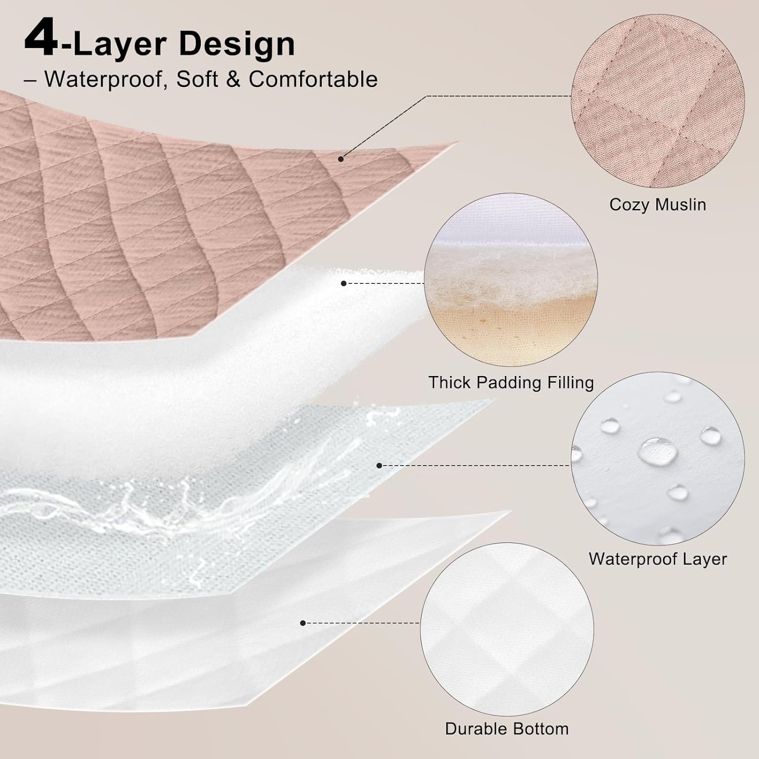 - Full Protection and Comfort: Our changing pad cover is made of three layers materials: the top layer is 100% muslin, soft and absorbent for gentle care of your baby’s skin; the middle layer is padded for added thickness and softness, while the bottom layer is waterproof polyester to prevent moisture from seeping through, keeping your changing pad dry and clean