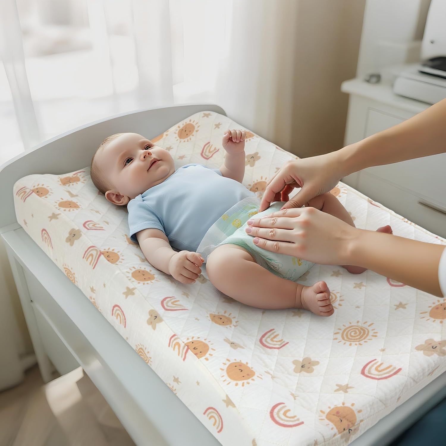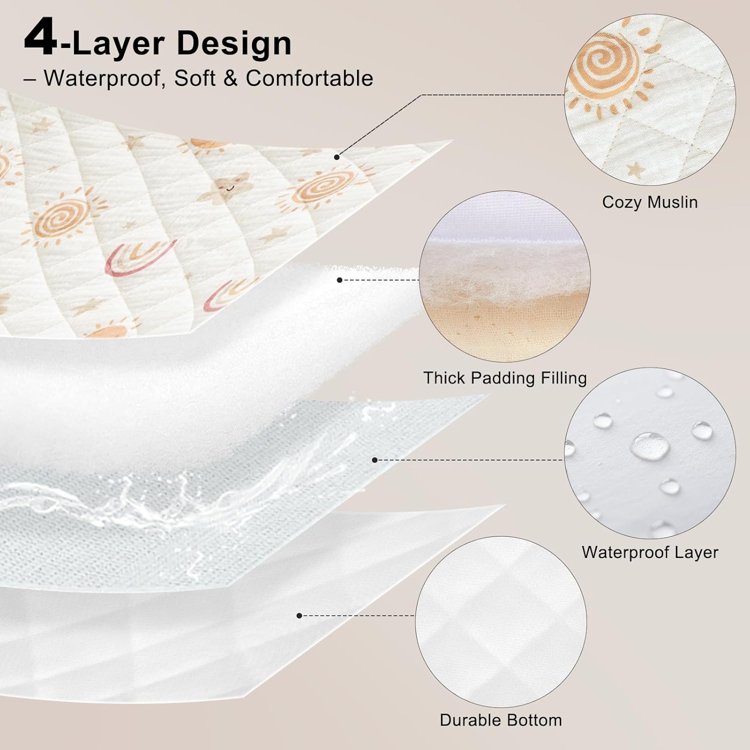 - Full Protection and Comfort: Our changing pad cover is made of three layers materials: the top layer is 100% muslin, soft and absorbent for gentle care of your baby’s skin; the middle layer is padded for added thickness and softness, while the bottom layer is waterproof polyester to prevent moisture from seeping through, keeping your changing pad dry and clean