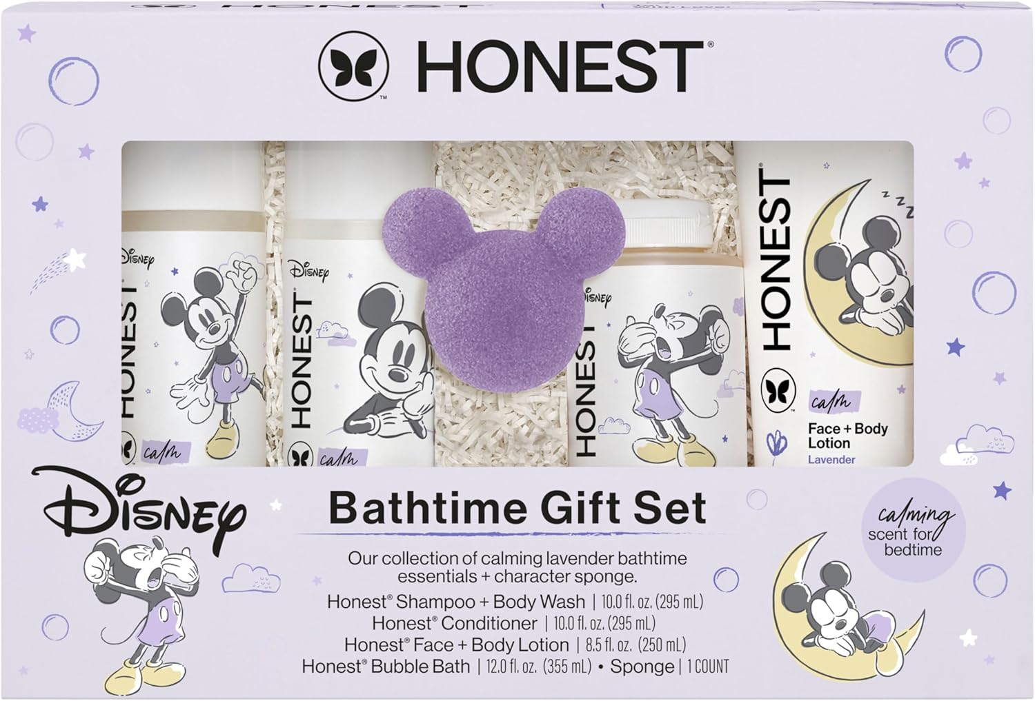 The Honest Company Calm Lavender Bathtime Gift Set and Disney Design Hypoallergenic Bath for Sensitive Baby Skin Shampoo and Body Wash Face and Body Lotion Bubble Bath Conditioner Sponge