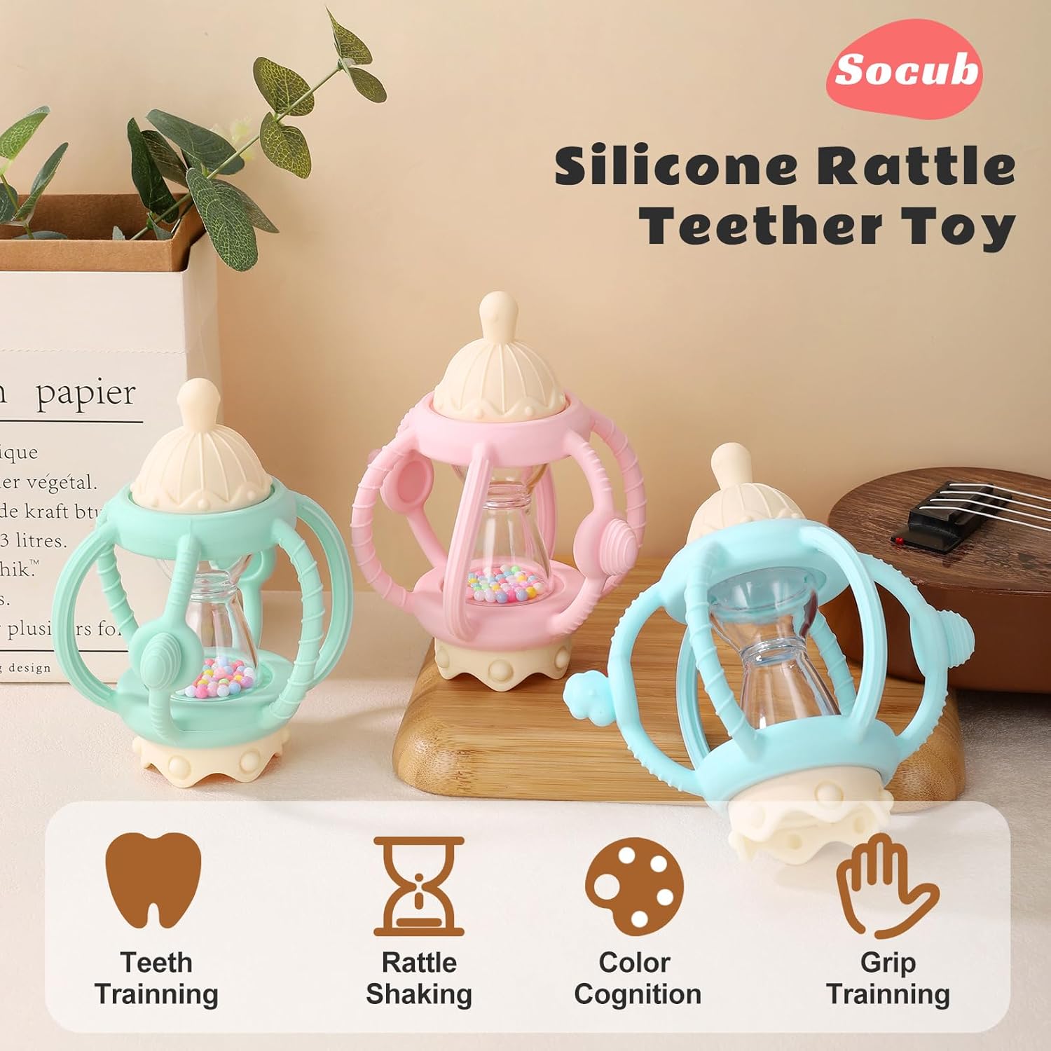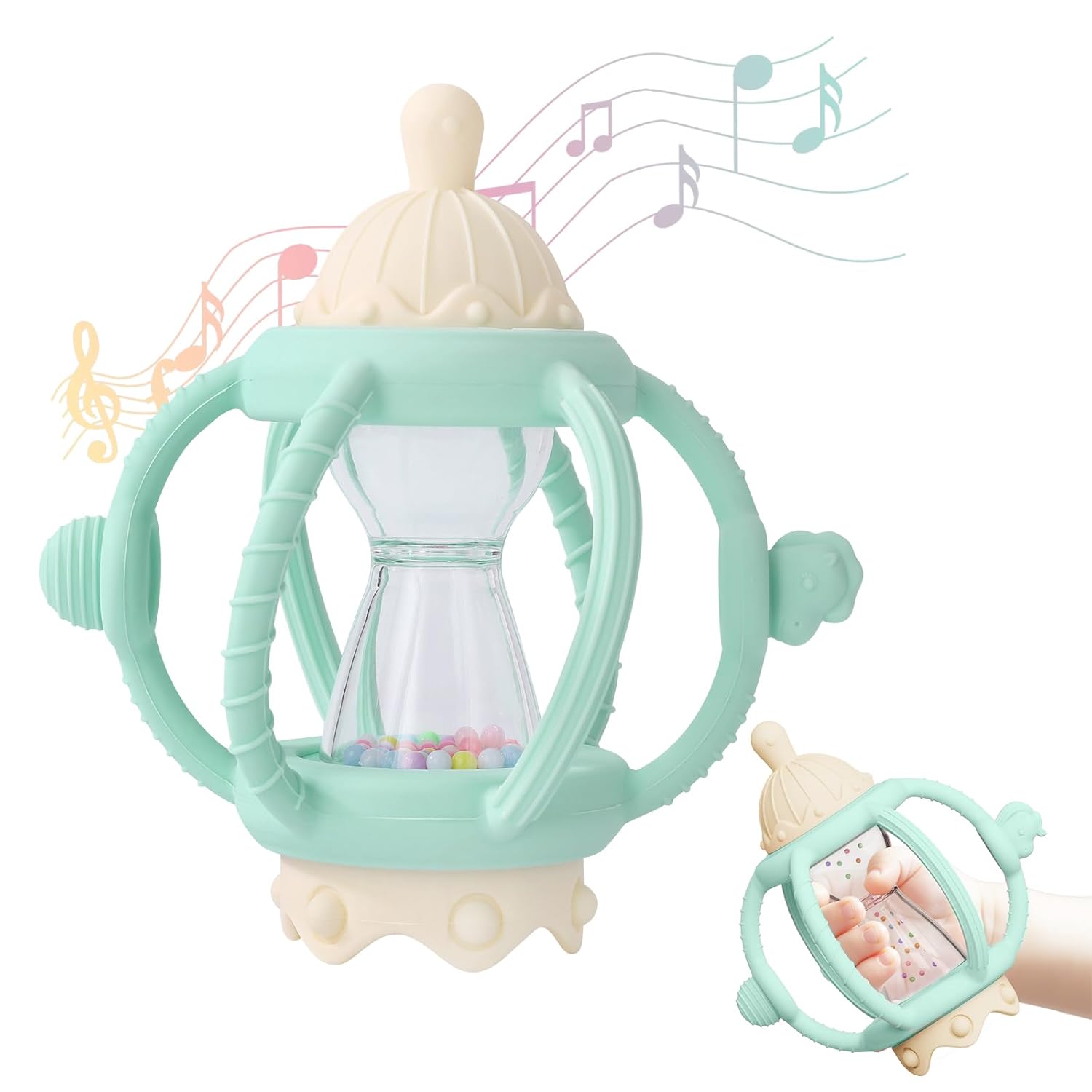 - 2-in-1 Teether & Rattle Combo- Designed for babies 0 months and up, this toy combines a soothing teether and a fun rattle. The sandglass is made of durable ABS and filled with colorful beads that create gentle, crisp sounds when shaken—ideal for visual and auditory stimulation.