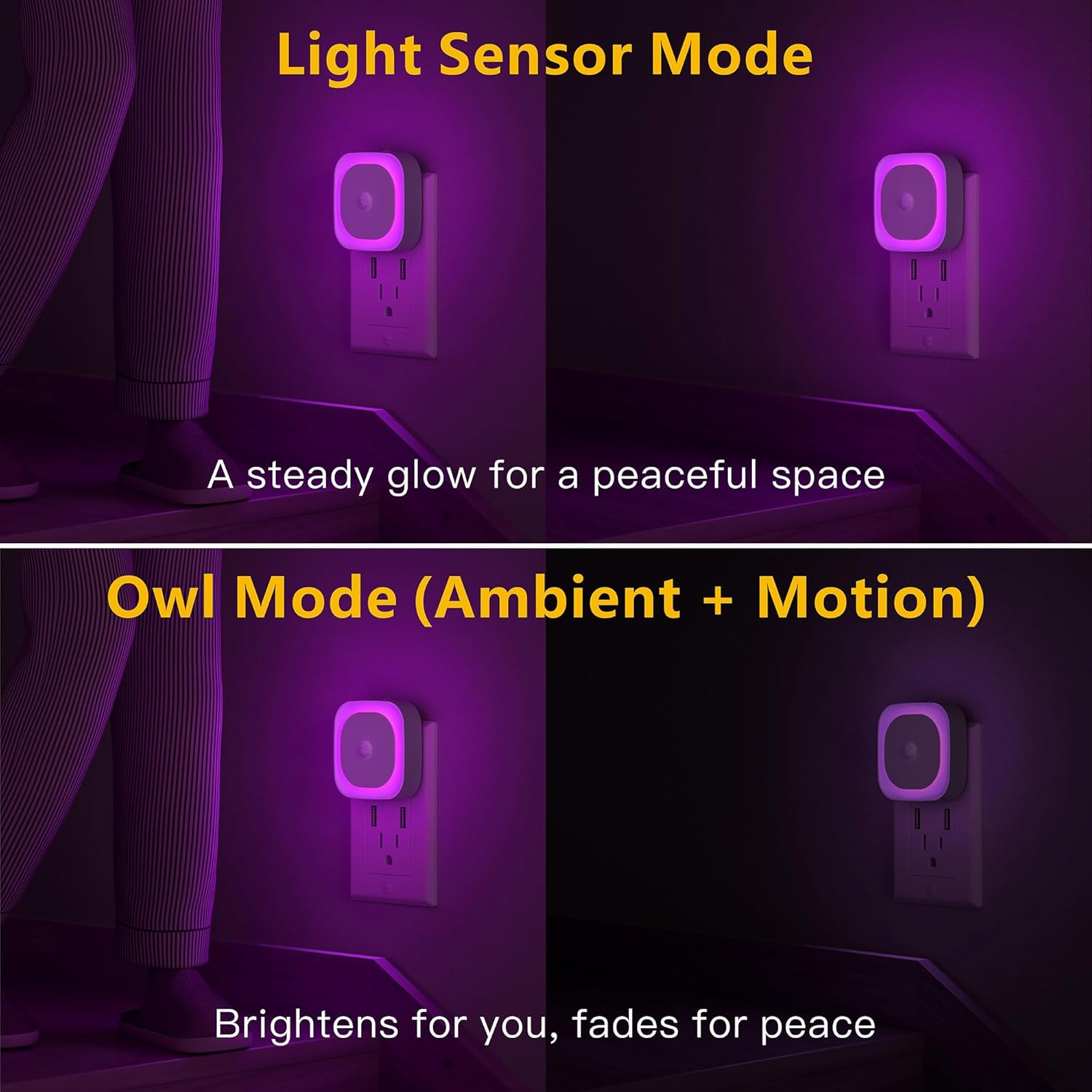 - 【Light Sensor and Motion Sensor Mode】:In Light Sensor Mode, the nightlight automatically turns off at dawn and turn on at dusk, no additional operation is required, making it ideal for bedrooms or stairways. In Motion Sensor Mode, the motion activated night light will auto-on in the darkness and then auto-off after 60 seconds of inactivity to save energy, suitable for areas where constant lighting is unnecessary.