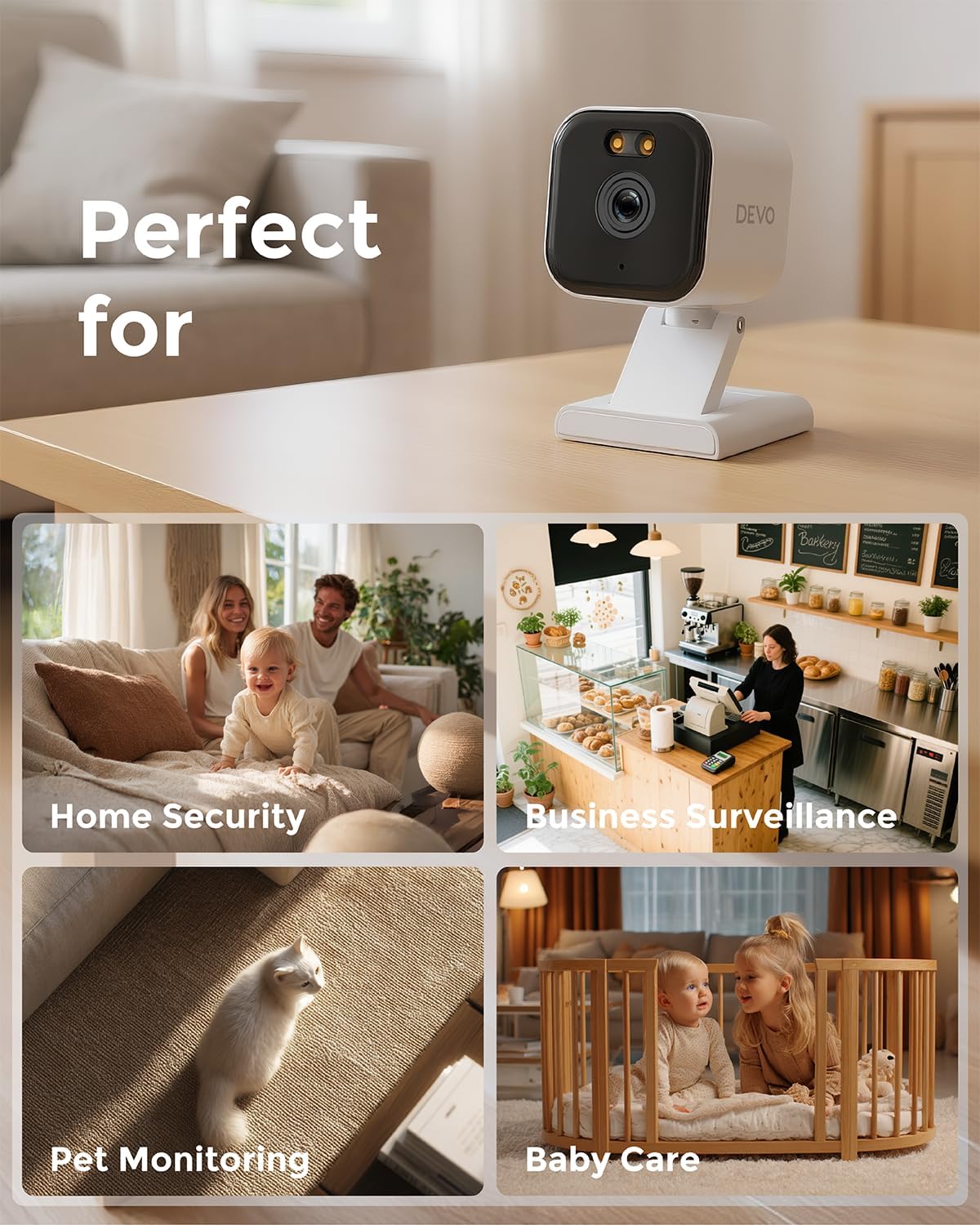 Devo Security Camera 2K |WIFI6 | Indoor |Baby Monitor & Pet Camera | 2-Way Audio, Color Night Vision, Live Stream, Motion Alerts & Notifications White,1 Cam