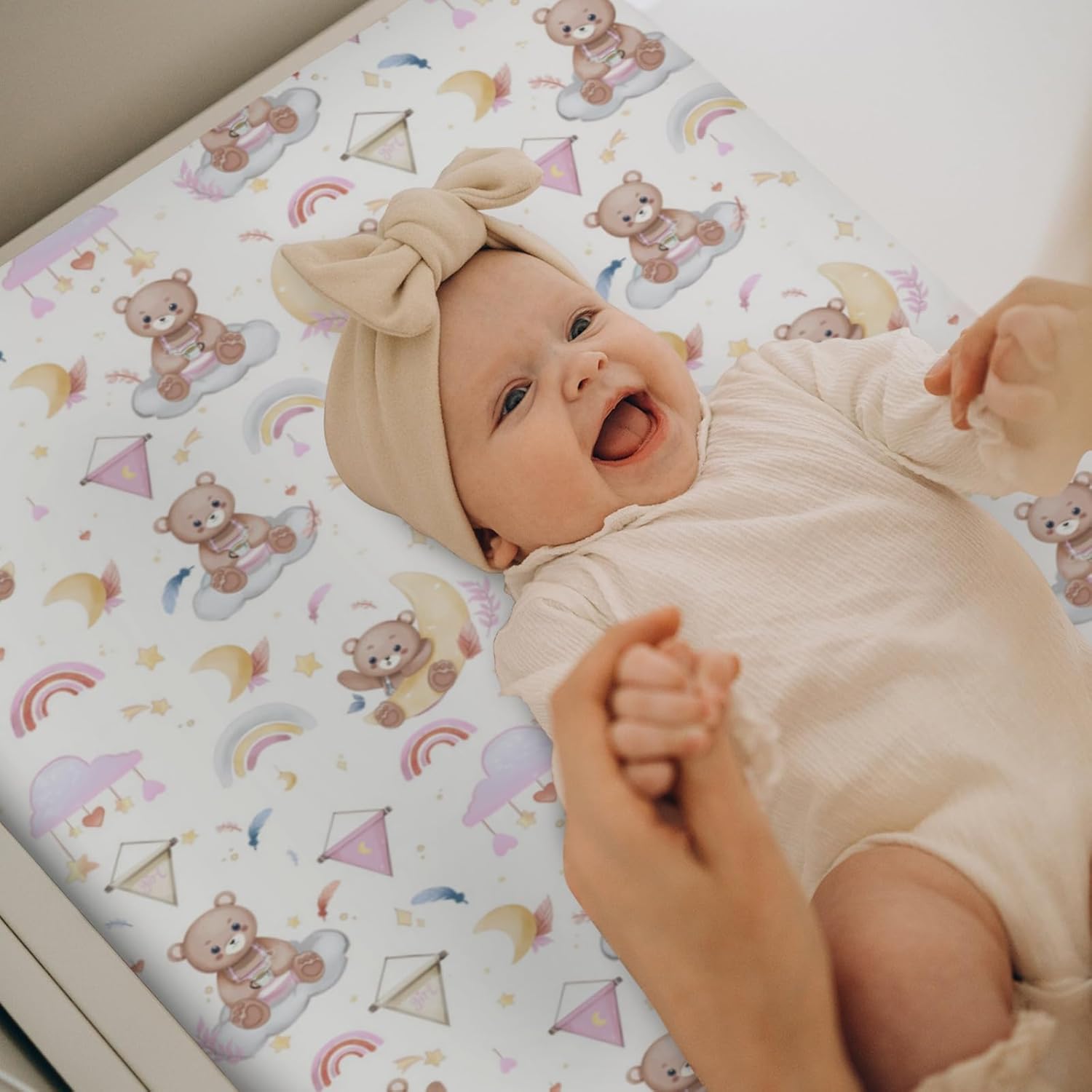 Watercolor Bear Rainbow Pink Changing Pad Covers for Baby Girls Cute Bears Moon Stars Clouds Fitted Change Table Covers Mats Animal Soft Diaper Changing Table Sheets for 32''×16'' Contoured Pad