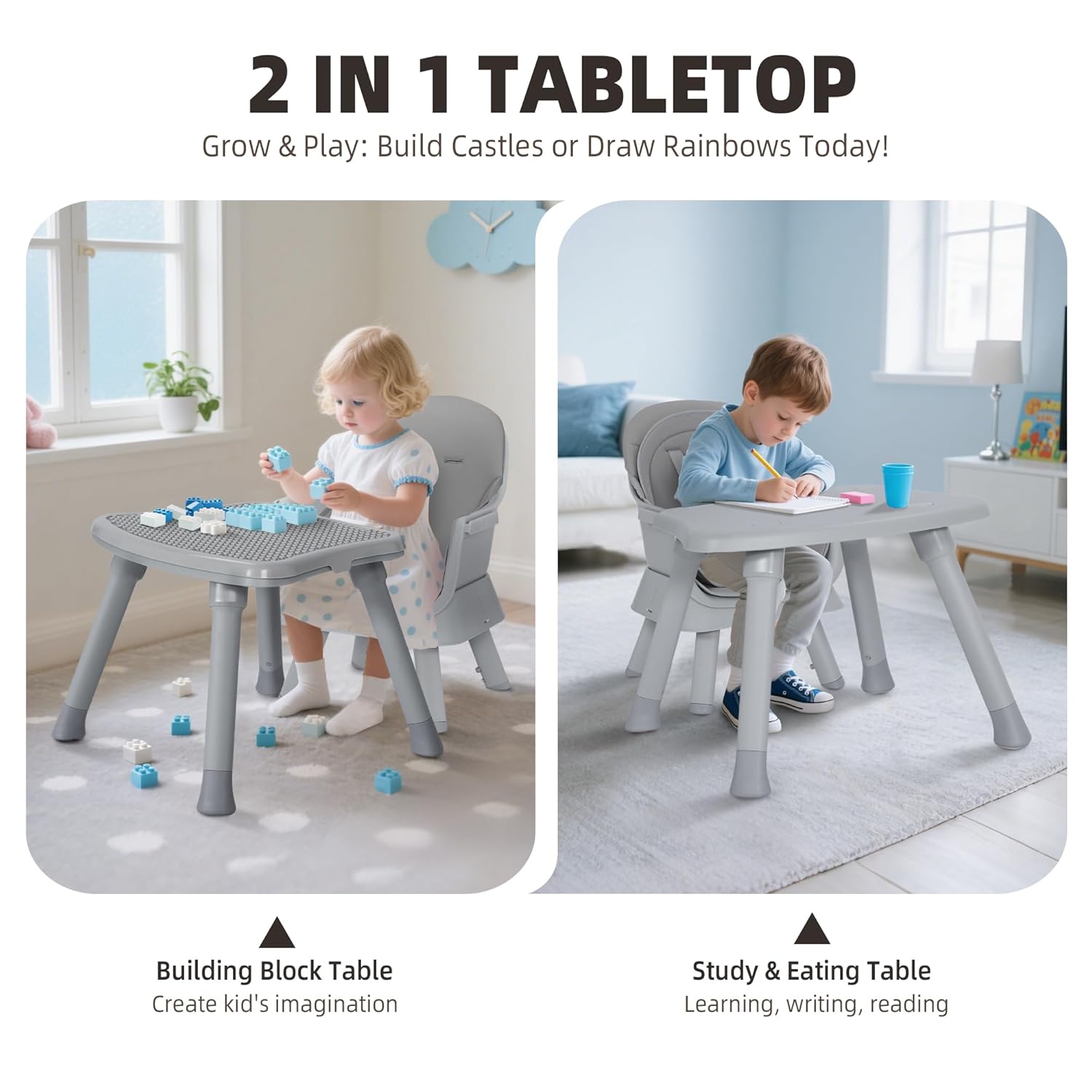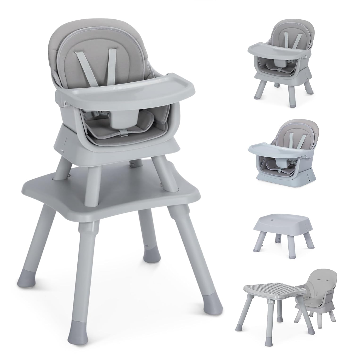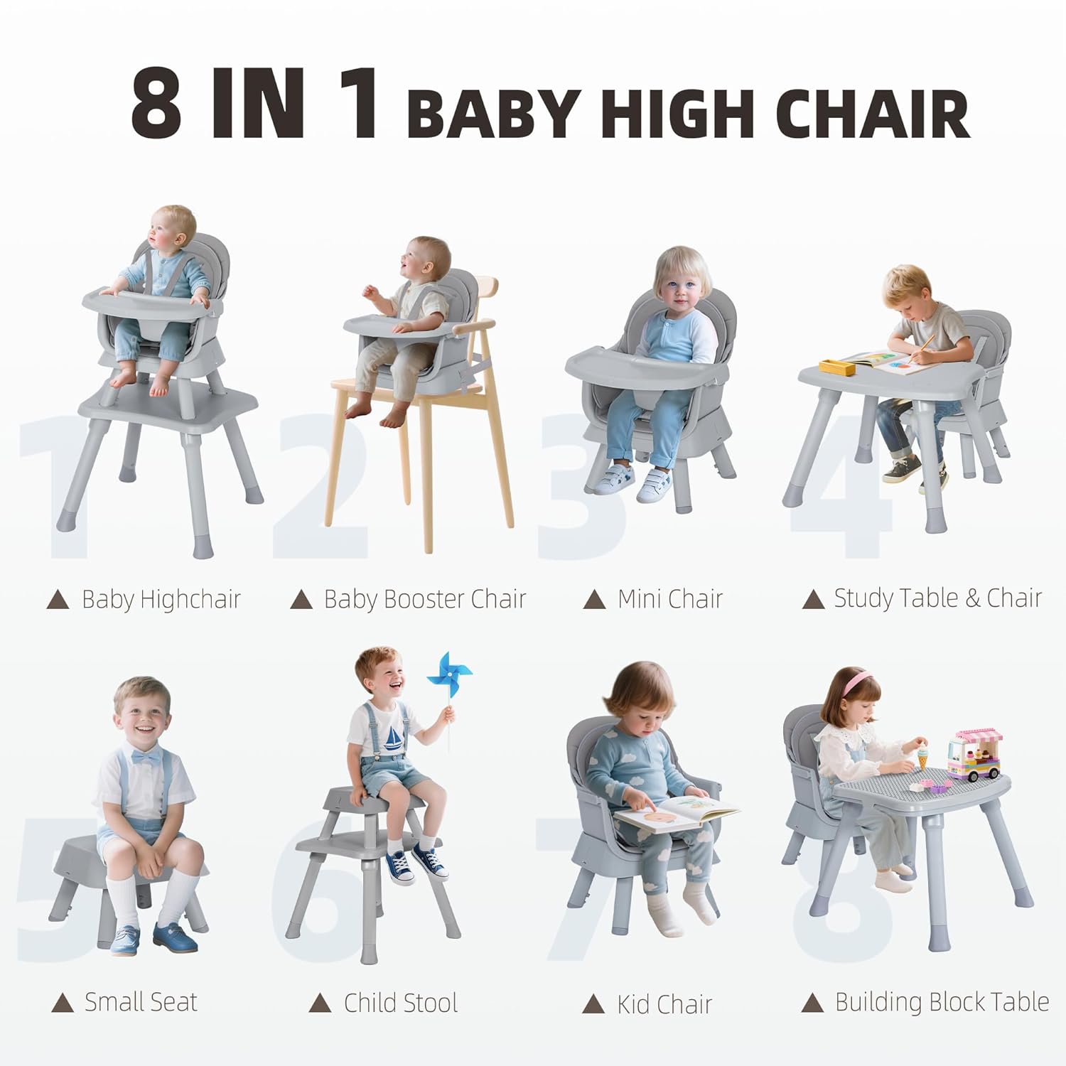 8 in 1 Baby Highchair, Convertible High Chair for Babies and Toddlers, Booster Seat w/5-Point Safety Belt, Toddler Building Block Table, Dishwasher Safe Tray, No Tool Install, Gray