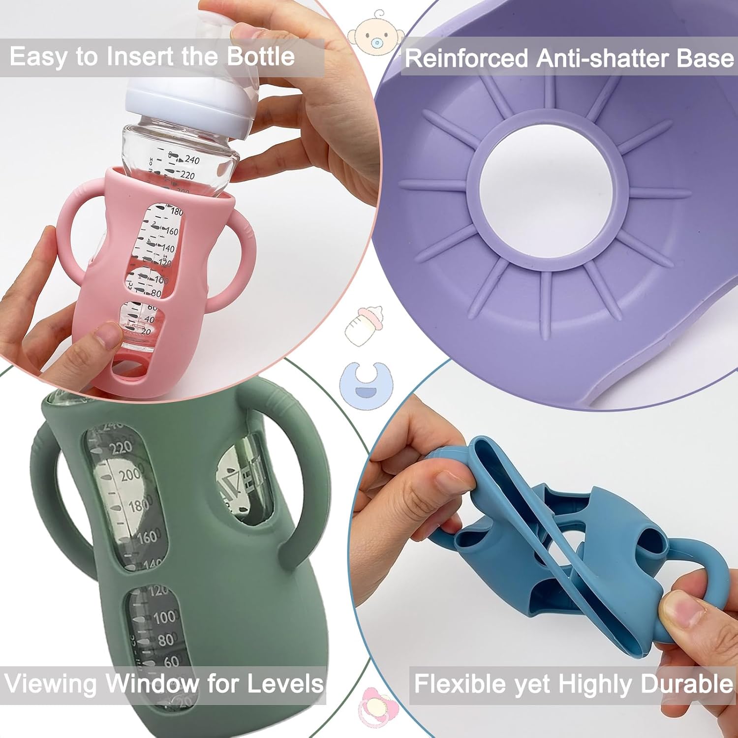- Noise Reduction & Thermal Insulation - Thick and flexible silicone cushions the glass bottle, dampening clinking sounds on hard surfaces for quieter nighttime feedings. It also provides excellent thermal insulation, making bottles safer and easier to remove from warmers without scalding, and keeping milk warm longer, ensuring comfort and peace during every feeding.