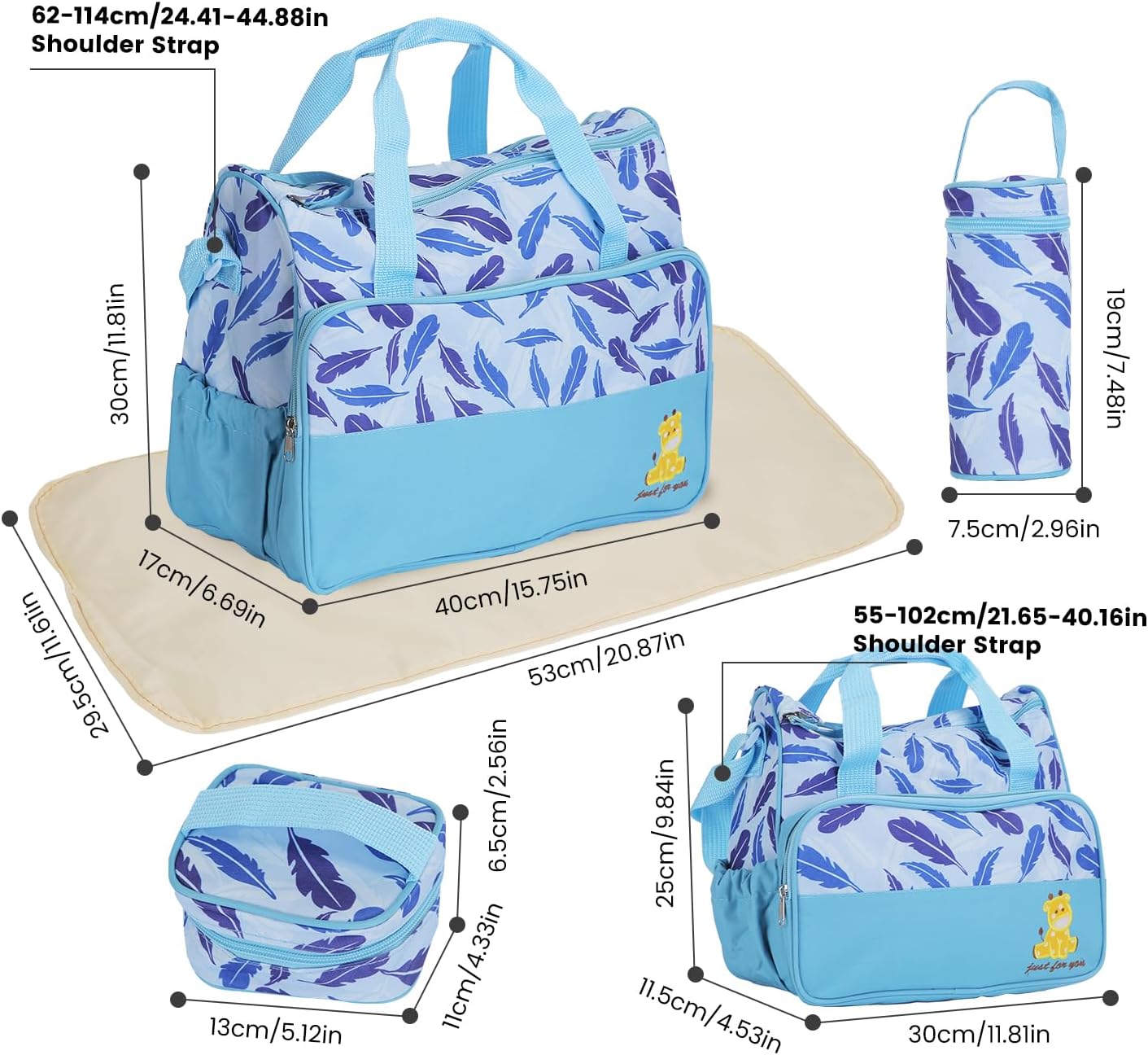 - 🎒 Complete 5-Piece Diaper Bag Set: Includes a large diaper bag, small diaper bag, food bag for snacks, bottle bag for feeding bottles, and diaper pad for changing, covering all essential storage needs for baby care during outings to keep you prepared and organized.